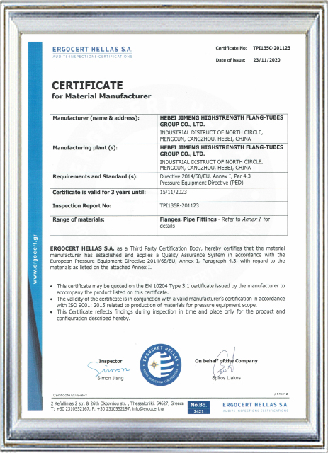 Компания JIMENG Group, основанная в 1989 году, производит фланцы, колена, тройники, редукторы, ниппели и муфты для трубопроводов нефти и природного газа, нефтеперерабатывающих и нефтехимических предприятий, атомных электростанций и электростанций, очистных сооружений, дамб и гидроэлектростанций, а также судостроительная промышленность. JIMENG Group имеет самый большой складской ассортимент фланцев в округе Мэнцунь Хуэй-Автомонус.